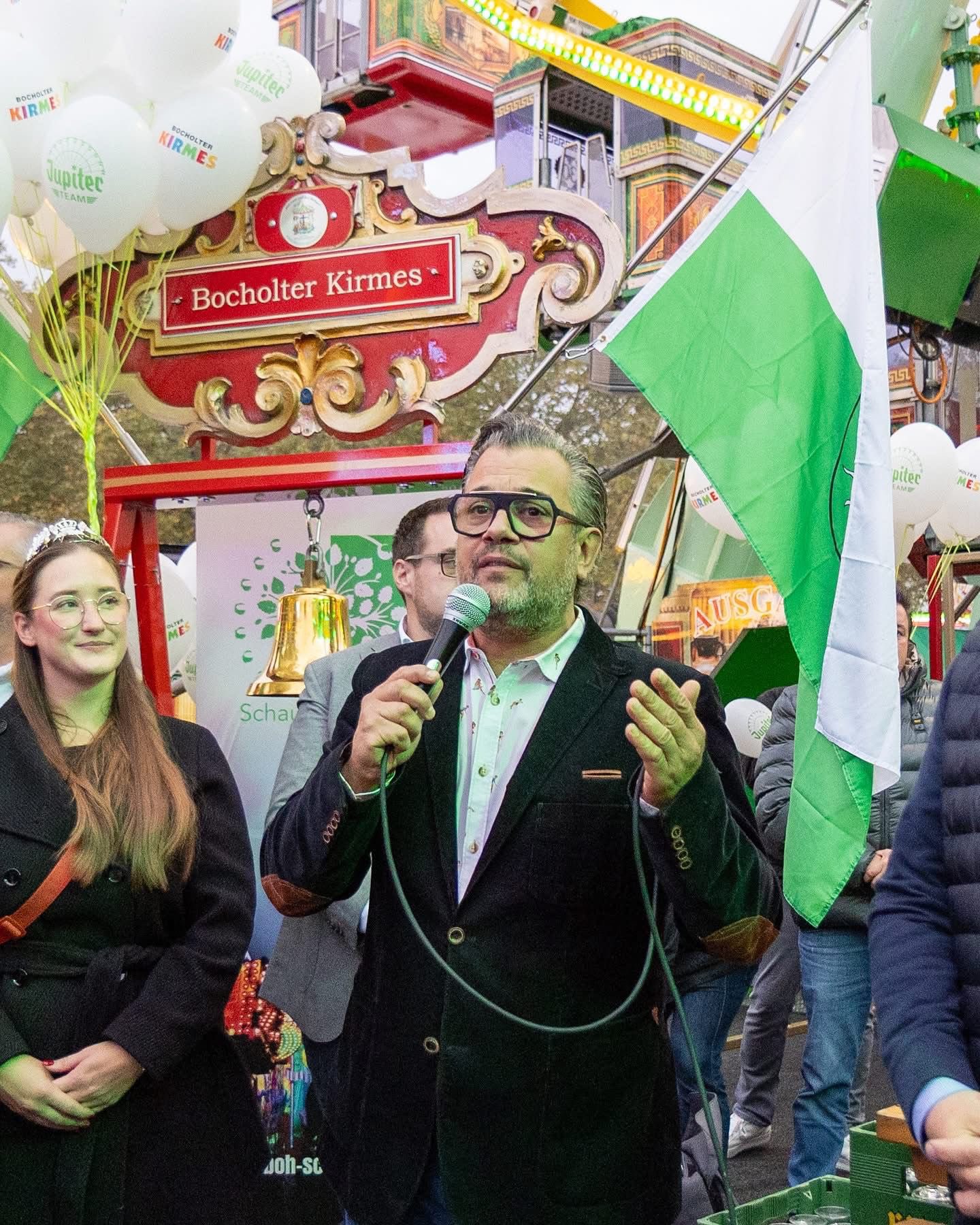 Neben zahlreichen Schaustellerfamilien waren auch Vertreterinnen und Vertreter der Stadtgesellschaft, der Politik sowie viele interessierte Besucherinnen und Besucher beim feierlichen Auftakt der „fünften Jahreszeit“ in Bocholt dabei. Die Eröffnung begann traditionsgemäß mit drei symbolischen Glockenschlägen – ein Sinnbild für die enge historische Verbindung zwischen Kirche und Kirmes, die sich vom Begriff „Kirchmesse“ ableitet – gefolgt vom offiziellen Fassanstich durch den Bürgermeister.